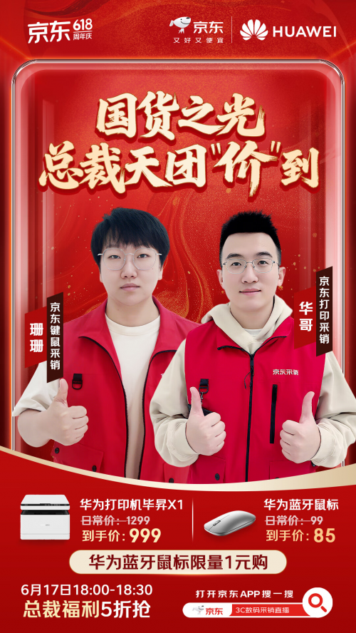 超值优惠、爆款免单、限时秒杀……精彩福利不间断,6月17日15点至21点,锁定京东3C数码采销直播间,国货总裁将带你领略国货魅力。