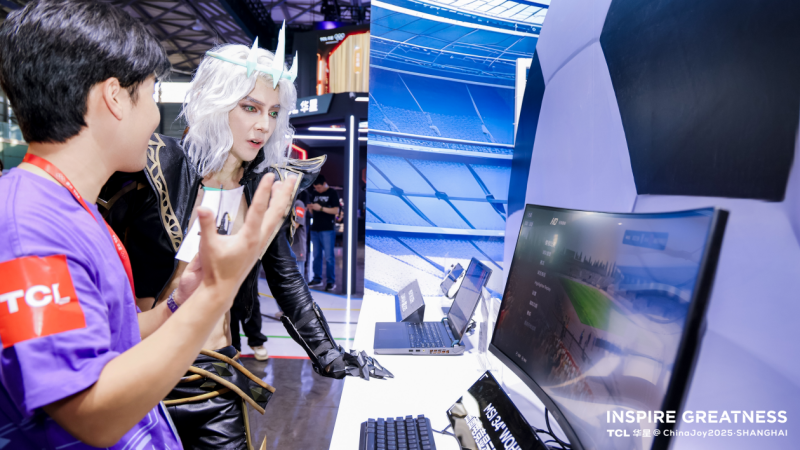 TCL展台,汪东城以佛耶戈经典造型登场——紧身战甲勾勒出凌厉腰线,手持破败王刃的气场引爆粉丝尖叫。他不仅与玩家组队开黑,更亲自演示微星新品显示器MAG 346CQ 黑刃的游戏性能。