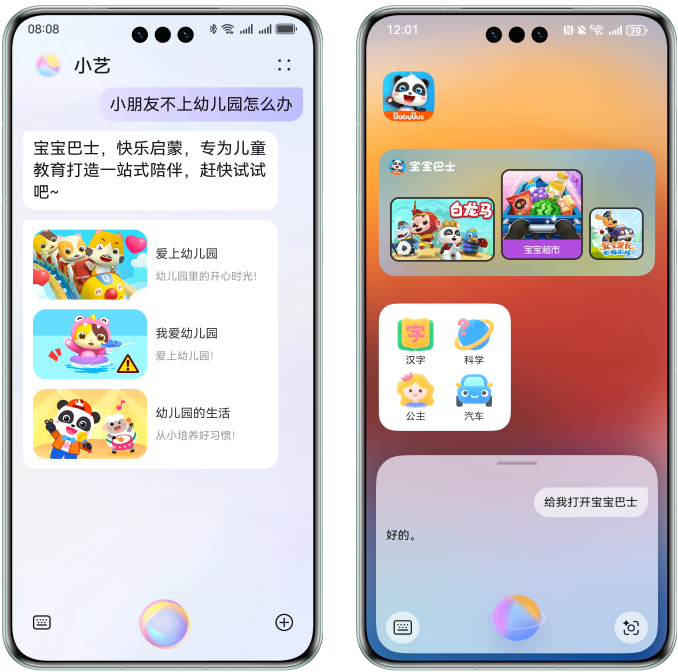 基于HarmonyOS的意图框架及AI大模型能力,教育类应用可在日常使用时更智能地响应用户需求。如在洪恩识字App中,结合用户日常使用习惯,小艺建议可定期、定时推送“待学字”的相关课程,帮助用户轻松完成学习规划;如在宝宝巴士App中,用户可以通过小艺推荐、呼唤小艺语音唤醒等方式,快速直达需求功能页,省去层层跳转步骤。