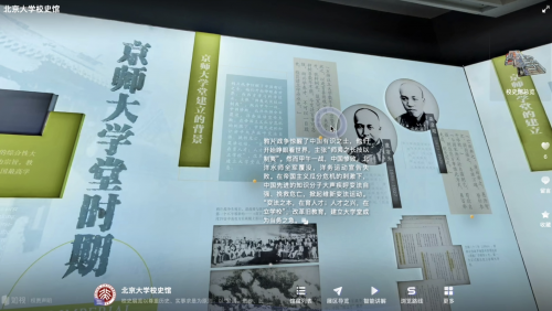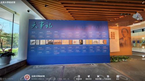 跟随VR指引,首先来到校史馆门口,接着进入地下二层,这里是北京大学百年校史陈列,完整呈现了北大百年发展的九个阶段。同时,还设有北京大学名人墙,展示了北大历史上杰出的革命家、思想家、理论家、科学家、教育家的生平与风采。