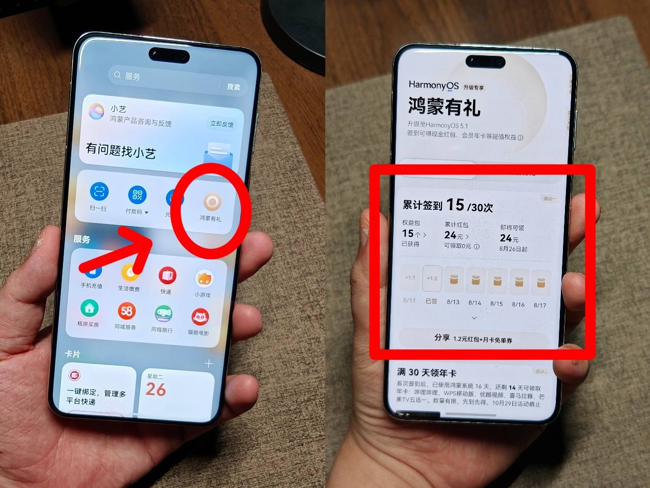 原来只要升级到鸿蒙5.1,在手机桌面右滑到负一屏找到“鸿蒙有礼”,每天签到就可以领取随机现金红包+超值权益!