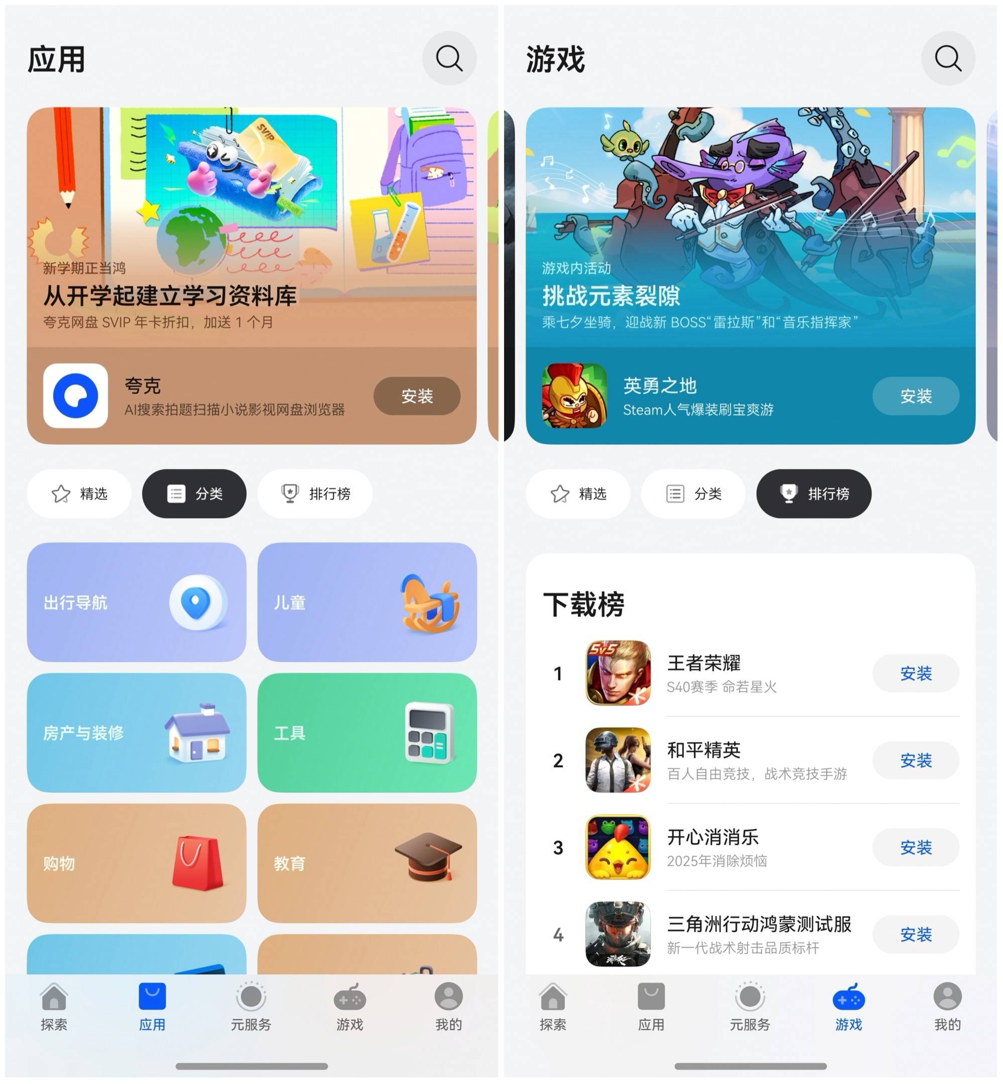 除了直接搜索App,你还可以在“应用”或“游戏”页面逛逛,顶部是编辑为你推荐的近期热播影音、限时活动、重磅更新、游戏新赛季等App内容卡片,横向滑动浏览;点击腰部的“分类”,进入“工具”、“社交”或“教育”等类别探索更多同类应用。目前已新增“排行榜”类别,你可以到下载榜和口碑榜里,了解更多好玩、有趣、有用的App。