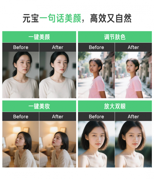在编辑中,元宝能智能完成磨皮、美白美黑、放大双眼等操作,彻底告别繁琐的手动调参。其效果自然不夸张,并能高亮呈现优化后的细节。