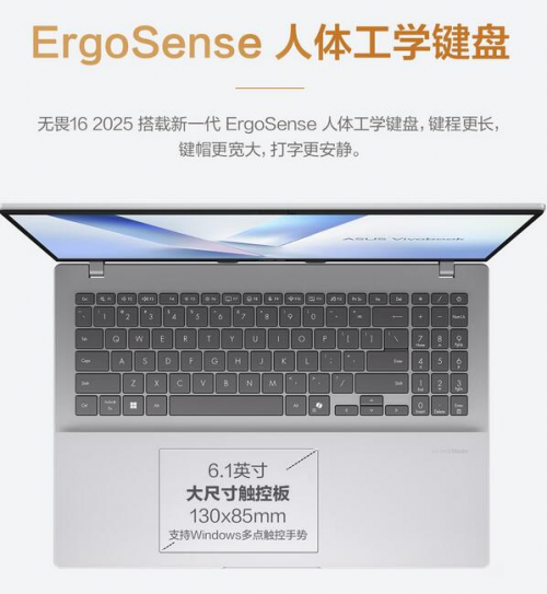 华硕无畏16 2025的机身C面采用了人体工学键盘,更长的键程和更大的键帽设计,不仅让打字体验更加安静舒适,在图书馆、宿舍等安静环境中使用,也不会因打字声音过大而影响他人。6.1英寸大尺寸触控板,采用顺滑涂层并支持智能手势操作,触控更加自如,轻轻一划即可实现屏幕亮度、音量调节等功能,操作便捷高效。