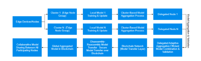 HCB 技术是一种针对协作边缘学习环境的混合集群区块链方法,采用了基于集群的模型更新机制,并结合委托节点进行高效的模型聚合。该方法通过一种新颖的反汇编-重组算法来实现模型的实际传输,显著减少了协作学习中的通信开销,并有效提升了系统对恶意攻击的抵御能力。
