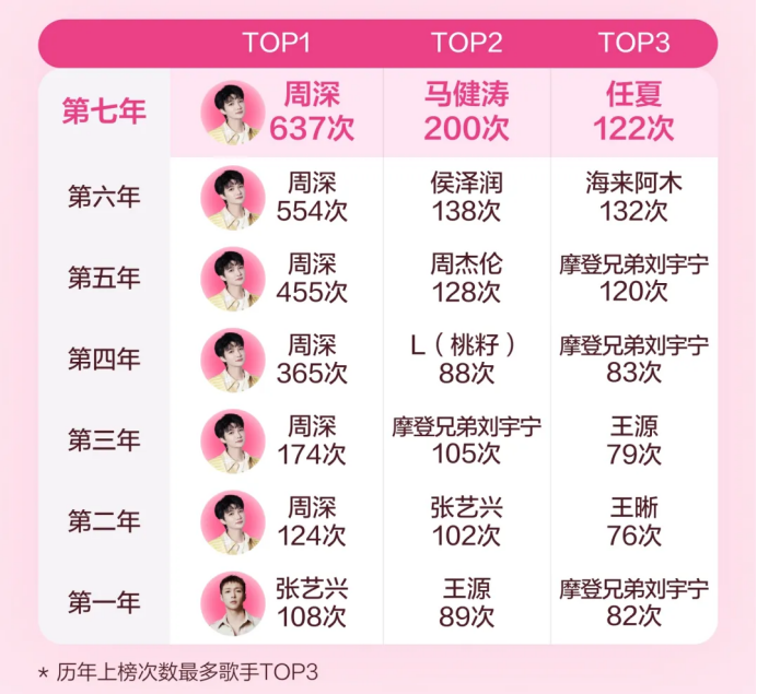 在歌手维度,周深以连续六年稳居榜首的纪录展现持久影响力,刘宇宁、王源、张艺兴等多次跻身TOP3阵营。七年间夺冠歌手队伍持续扩容,第七年新增15位冠军歌手中,90后与00后占比超八成,张峻豪、丁程鑫等新生代集体崛起,印证华语乐坛年轻化浪潮。