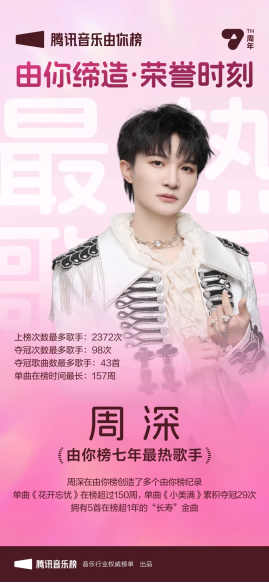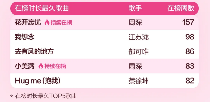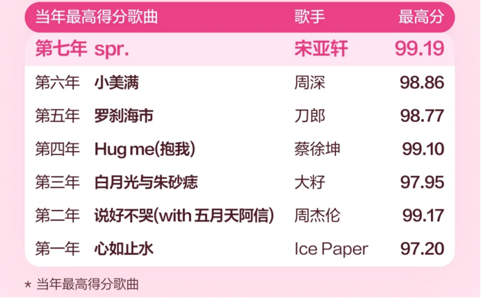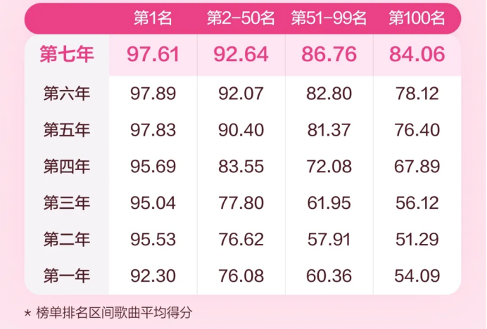 七年39首冠军歌曲数量同比翻倍,最高分值从首年97.20分跃升至99.19分,折射出华语音乐品质的持续攀升。值得一提的是,周深《花开忘忧》持续在榜超三年且稳居TOP20,成为长尾生命力的典范之作。