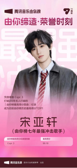 歌曲赛道竞争更为激烈。第七年上榜歌曲达1038首,同比增幅超15%,95分以上高分作品以年均30首速度增长,本年度184首高分曲目中,宋亚轩《spr.》以99.19分刷新由你榜历史最高分纪录。