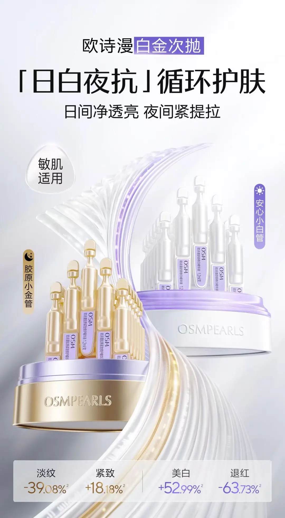 研究发现,肌肤昼夜面临不同挑战,日间光损加速暗沉,夜间氧化应激+睡眠不足破坏胶原合成,二者叠加易导致肌肤陷入「日暗沉、夜松垮」的恶性循环。针对消费者护肤痛点,欧诗漫以国际SCI前沿研究为基石,独创「日白夜抗」循环护肤理念,用珍珠科技精准破题——