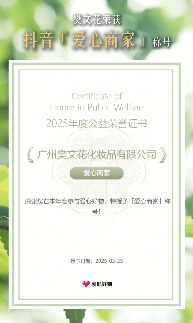 此次荣获抖音「年度公益伙伴」及「爱心商家」荣誉称号,是对樊文花过去公益成绩的褒奖,更是对其未来持续贡献的期许。樊文花正用行动证明,一个成功的品牌,必然是富有同情心和责任感的品牌,其“美丽事业”也因这份大爱而更加熠熠生辉。