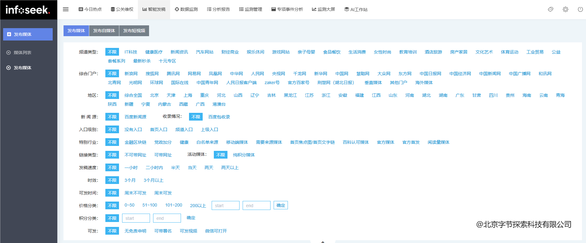 以前企业想发篇稿子,那真是够折腾的。先要到处找媒体联系方式,再一个个联系自媒体博主,费时费力不说,还经常找不到合适的渠道。Infoseek把这个难题彻底解决了——系统里整合了1.7万多家正规新闻媒体和超过40万家自媒体资源,还有20万个短视频达人。不管你想上新浪、网易这样的大门户,还是在行业专业平台发声,甚至是找小红书、抖音的达人合作,在系统里就能一站式搞定。