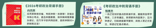 如果你是备战2026年考研的学子,那么10月正是复习考研政治知识的关键时期。由肖秀荣教授亲编的《2026考研政治背诵手册》,聚焦考研政治核心需求,将全年考点高度浓缩,精准直击命题关键,作为历经多年考研实践检验的优质资料,它深受百万学子信赖,是考生冲击80+高分的重要备考工具。另一本由陆寓丰编写《考研政治冲刺背诵手册》,书中独创的三步背诵法,可实现“减负提速”的记忆效果;“五分钟速记”配套扫码学习功能,便于考生利用碎片时间强化记忆;阅卷人视角的笔记式批注,更能帮助考生精准把握考点重难点,为考研政治冲刺阶段的复习提供科学指引。