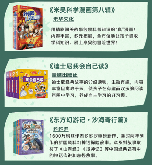 若你想给孩子选读物,为日常添趣味,这三本书堪称优质之选。由未华文化打造的《米吴科学漫画第八辑》,以精彩的闯关故事为载体,将科普知识巧妙融入其中,打造出“真”漫画质感,让科普学习不再枯燥。由童趣出版社推出《迪士尼我自己会读》,书中内容生动有趣、丰富多样,为孩子的阅读启蒙与成长助力。《东方幻游记・沙海奇行篇》的作者多多罗以《山海经》《搜神记》等中国经典名著中的神话传说、志怪故事为创作根基,结合巧思与创新,为孩子带来全新的有趣故事!