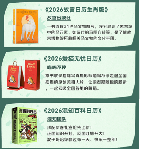 步入2025年第四季度后,2026的步伐也越来越近,换新日历即将成为刚需。若你想在使用日历的同时感受中国传统文化的多元魅力,京东为你带来三本佳品。《2026故宫日历生肖版》以专业科普视角解读传统文化,精选31件故宫马文物,用日历形式将文物知识拆解成每日可读内容,高清呈现文物细节的同时传递历史内涵,能帮你轻松搭建对故宫马文物的认知,是亲近传统文化的优质入门选择。《2026爱猫无忧日历》以萌宠治愈为切入点,将萌猫与中式场景巧妙融合。翻阅时,你既能在萌猫的可爱形象中获得慰藉,又能潜移默化地接触传统文化元素,让传统文化多一份温度与情感共鸣。由混知团队编写的《2026混知百科日历》,给你带来顶配新春礼盒,抢先上新诚意满满。日历设计独具巧思,正面知识干货满满,反面吐槽幽默风趣,让传统文化知识以最有趣的方式贴近你的生活!