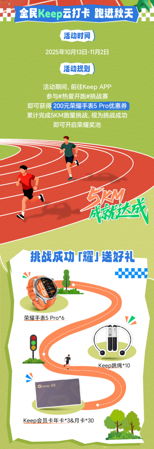 10月13日,荣耀携手知名运动健康平台Keep推出 “荣耀「热爱开跑」跑量挑战赛”正式上线。活动期间(2025年10月13日~11月2日),用户登录Keep App即可报名参与,参与者可自选项目,在活动规定时间内累计完成即视为挑战成功。完赛者即可获得200元荣耀手表5 Pro优惠券,更有机会开启荣耀奖池,赢取荣耀手表5 Pro(6台)、Keep跳绳(10件)、Keep会员年卡(3张)及月卡(30张)等好礼,体验运动与荣誉的双重喜悦。