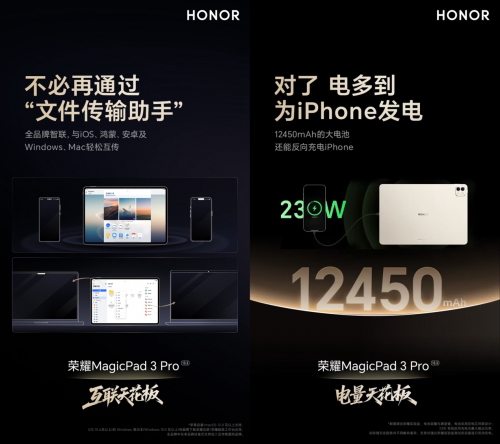 作为“互联天花板”,荣耀MagicPad3 Pro打破系统壁垒实现全品牌智联,无需依赖文件传输助手,即可与iOS、鸿蒙、安卓、Windows、Mac设备轻松互传,让跨设备协作更顺畅。而作为“电量天花板”,12450mAh超大电池带来长效续航,更支持反向充电iPhone,为消费者告别电量焦虑。