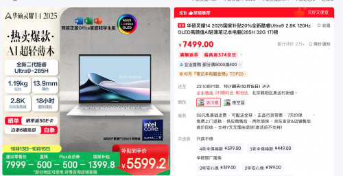 华硕灵耀14 2025是一款集强劲性能、轻薄便携、长续航以及高效AI于一体的高品质轻薄本,能助力你大幅提升工作效率。目前临近双十一促销,该产品直降500元,京东PLUS会员还可叠加使用500元PLUS会员券,到手价仅5599元。此外,还有6期白条免息,晒单返50元E卡。感兴趣的朋友可上京东搜索#华硕灵耀14 2025#,抓住这波福利。(具体国补政策详情请咨询京东客服)