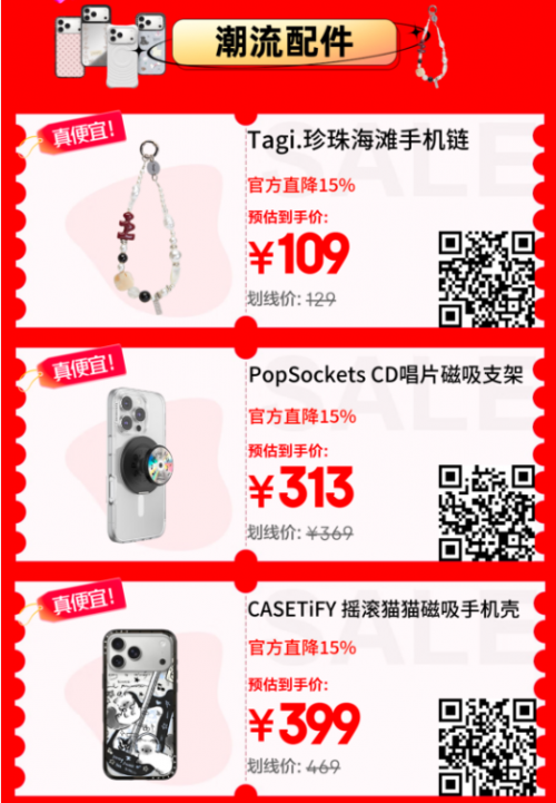 想让手机配件不撞款还够潮?这些潮流配件值得入手。CASETiFY摇滚猫猫磁吸手机壳,适用于iPhone 17系列手机,酷感摇滚猫图案,极具个性。日常价469元,京东11.11预估到手价399元。Tagi珍珠海滩手机链,灵动的珍珠、贝壳点缀于手掌间,为日常搭配增添了浪漫元素。日常价129元,京东11.11官方直降15%,预估到手价109元;PopSockets CD唱片磁吸支架,复古CD造型,听歌追剧都适用。日常价369元,京东11.11预估到手价313元。