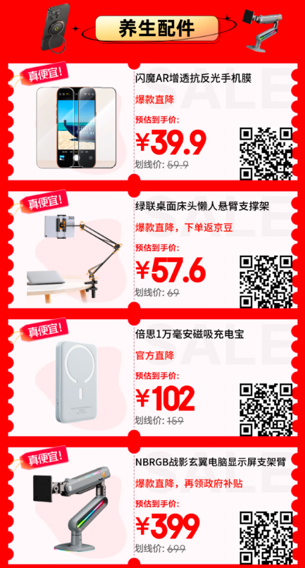 长时间使用电子产品,不仅需要护眼,更需舒适配件的贴心守护。闪魔手机膜,具备AR增透抗反光功能,有效缓解长时间使用带来的视觉疲劳,京东11.11预估到手价39.9元;绿联懒人悬臂支撑架,支持手机与平板多角度调节,躺卧追剧也能彻底解放双手,保护颈椎,京东11.11预估到手价57.6元;NBRGB占影玄翼电脑显示屏支架臂,支持自由悬停,全面释放桌面空间,京东11.11预估到手价399元;倍思1万毫安磁吸充电宝,超薄设计减轻手腕负重,磁吸快充兼顾便捷与健康,京东11.11预估到手价102元。