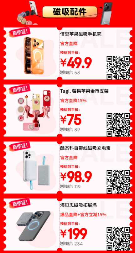 告别繁杂线材,磁吸配件让连接更轻松、使用更自由。倍思苹果磁吸手机壳,有效防止刮擦,强磁吸附兼容多种配件,支持无线充电与车载导航,京东11.11预估到手价49.9元;Tagi莓果苹果金币支架,一贴即合,多角度自由支撑,京东11.11预估到手价75元;酷态磁吸充电宝,自带线材,吸附即充,出行更便捷,京东11.11预估到手价98.9元;海贝思磁吸拓展坞,轻松扩展多种接口,移动办公更高效,京东11.11爆品直降叠加官方立减15%,预估到手价199元。
