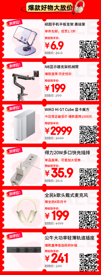 此外,京东11.11还有多款高性价比3C配件持续放价。其中,硕图手机平板支架限时1.7折,单件包邮,预估到手价只需6.9元;NB显示器支架机械臂爆款直降,预估到手价199元;WIKO Hi GT Cube显卡魔方,爆款直降1000元,预估到手价2999元;全民K歌头戴式麦克风,预估到手价199元,还赠全民K歌月卡;得力20W多口快充插排,单品直降还可叠加大促券,预估到手价35.9元;公牛大功率轻薄轨道插座,爆款直降叠加政府补贴后预估到手价241元。