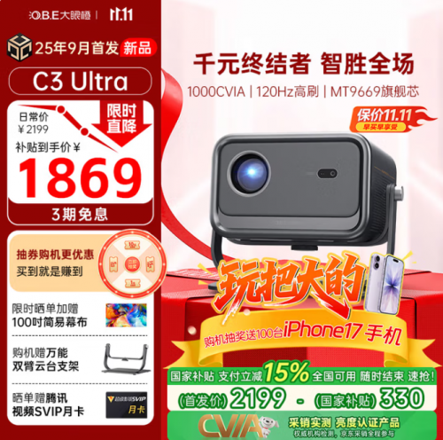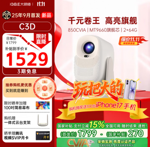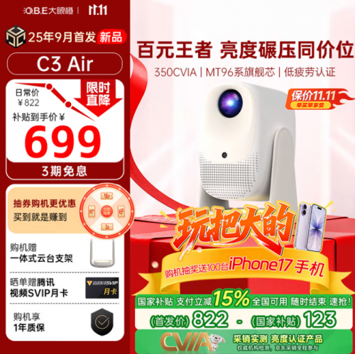 从百元入门款到千元旗舰款,大眼橙三款新品精准覆盖不同预算、场景需求,每款都做到 “参数不虚标、体验不缩水”。叠加“购机抽100台 iPhone17”的重磅福利,以及双十一国补立减、抽券下单、免息优惠等等,堪称“2025最值得入手的投影品牌”。