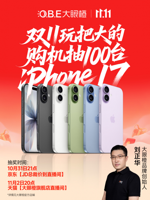 为回馈消费者支持,大眼橙双十一大促期间推出史无前例的抽奖活动:10月9日-11月11日期间,在大眼橙官方旗舰店购买大眼橙C3系列新品投影仪,即可自动获得100台iPhone17抽奖资格,首轮抽奖将在10月31日京东【JD总裁价到直播间】、11月2日天猫【大眼橙旗舰店直播间】进行。