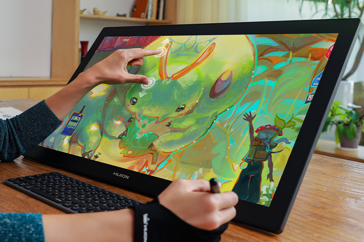 Kamvas Pro 24 (Gen3)还新增了触控功能,兼容Windows、Mac双系统,最高支持10点触控,用户可直接通过触控和手势进行拖移、旋转、缩放等快捷操作,机身上还设有触控开关,便于用户根据使用习惯进行控制。
