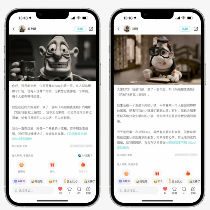 不久前,Soul与经典动画电影《玛丽和麦克斯》合作,推出基于原片主角的虚拟角色,用户可在平台中与“玛丽”和“麦克斯”发起对话、分享心情甚至获得情感安慰。这一尝试不仅是IP数字化运营的创新,更是Soul在“AI+社交”领域深度布局的体现。