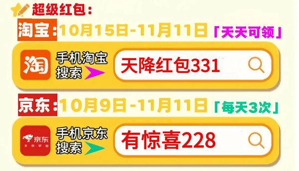 掌握了这些2025年京东淘宝双十一的活动时间表、红包口令及满减攻略,京东搜索“有惊喜228”、淘宝搜索“天降红包331”,相信你一定能在这场购物狂欢中斩获满满,以最实惠的价格买到心仪商品。记得提前规划购物清单,设置好闹钟,准时开启省钱购物之旅!