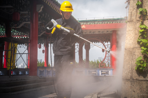 为杜绝古建损伤风险,卡赫组建了一支由30名清洁专家组成的团队,前期多次实地勘测——从污染区域分布、建筑材质硬度,到墙体高度、石材纹理,每一处细节均精准把控。最终确定以蒸汽清洗为核心方案,即选用卡赫热水高压清洗机,通过95℃且压力仅在0.5-1 bar的高温低压蒸汽冲击石材表面,既能快速瓦解污垢,又避免损伤建筑肌理。同时,高温蒸汽还可杀灭石材孔隙中的植物种子和孢子,有效延缓污垢再生。