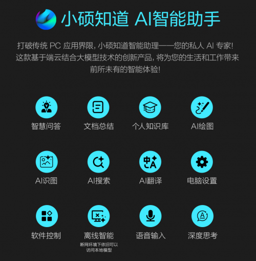 身处AI时代,华硕无畏Pro16 2025内置“小硕知道”AI智能助手,成为你工作提效的秘密武器。它支持智慧问答、文档总结、AI绘图、AI识图、AI搜索、AI翻译等多个功能,日常写文案、整理资料时,可以帮你找灵感、生成初稿或提炼核心信息,AI识图与翻译功能则适配跨语言办公、图片信息提取场景,大幅提升日常效率。更实用的是,“小硕知道”基于端云一体AI大模型,无网络环境下也能继续使用,避免在飞机高铁、户外等场景中因信号问题中断效率。