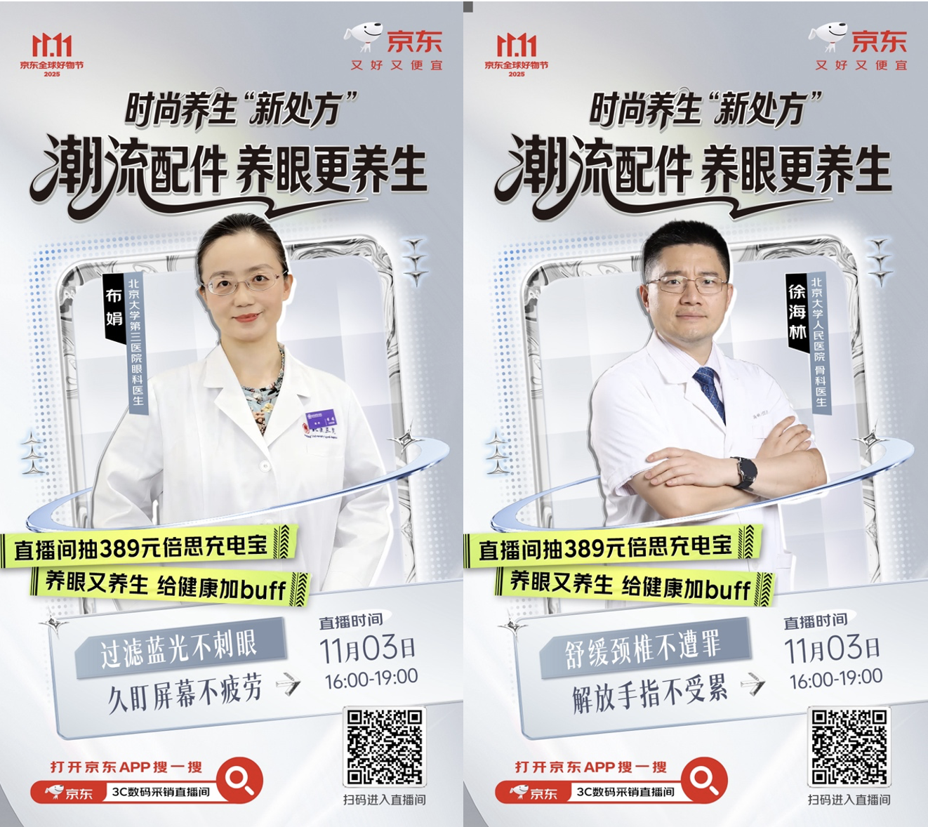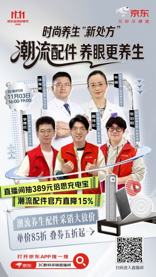 11月3日16点,京东潮流配件「养生」专场火热来袭!北京大学第三医院眼科医生布娟、北京大学人民医院骨科医生徐海林将做客京东3C数码采销直播间,和京东采销们畅谈养生技巧。值得一提的是,直播期间还有抽389元倍思充电宝、潮流配件官方直降15%等福利放送,让消费者在接受养生常识的基础上,也能轻松买到又好又便宜的配件。