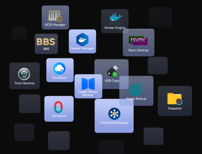 设备搭载的TOS 6系统支持Docker Compose与Portainer,可快速部署上千种容器应用,配合VirtualBox虚拟机功能,一台设备即可承载开发测试、影音服务、智能家居中控等多重角色。也适配即将上线,现在正处于内测阶段的TOS 7系统,50+新功能与千处细节优化,搜索速度提10倍,支持远程文件挂载与在线编辑,进一步强化操作效率。加上144TB超大存储与TRAID弹性扩容机制,极客可随心搭建从家庭多媒体中心到个人开发服务器的全场景方案。