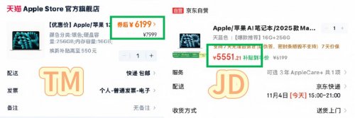 类似的还有MacBook Air M4 16G+256G,在JD领政府补贴后到手价5551元,而同款在TM的价格是6199元,比JD贵648元,可以再买一个妙控鼠标和保护壳了。对于想要入手的消费者来说,这个差价确实值得斟酌。