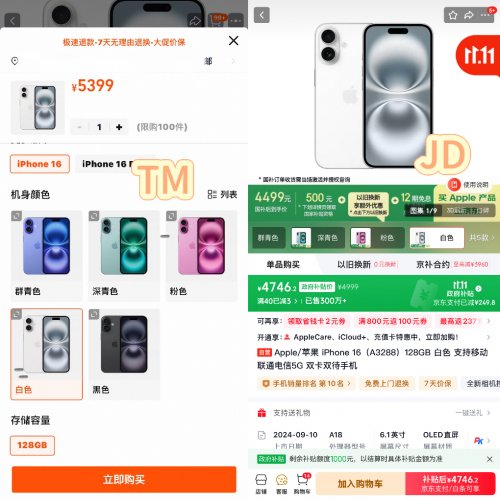 想要购买iPhone 16系列的朋友也要注意,在TM下单iPhone 16 128G不享受任何优惠,需要5399元,而在JD下单可享500元国补和以旧换新补贴,到手价4499元起,差价可是高达900元。