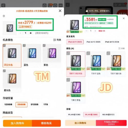 不仅是手机,iPad 11 Air 256G在TM双十一立减1100元后的标价为3779元,但在JD,同款限时直降1300元,还能叠加10%的政府补贴,PLUS会员最终到手价更低,价比TM便宜近200元。省下的钱足够购买一个原装手机壳了。