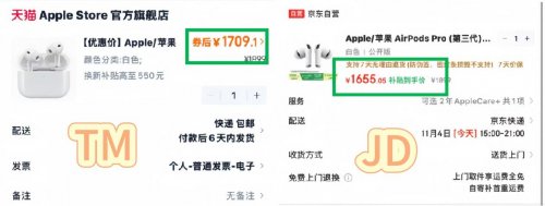 AirPods Pro 3代的价格也不例外,TM券后价1709元,在JD领取国补后立减,到手价只需1655元,比TM便宜54元,剩下的钱可以点一顿不错的外卖了。