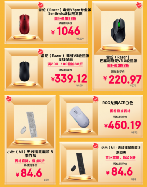 电竞玩家对鼠标性能有着更高追求。罗技GPW 3代粉色鼠标,外观时尚、响应迅捷,单件特惠叠加政府补贴后709元;GPW 2代金刚红款,颜值与性能兼备,到手价519元;雷蛇毒蝰V3 Pro专业版Sentinels战队限定款,专为电竞设计,国补叠加88折后1046元,适合追求极致操作的游戏用户。此外,雷蛇毒蝰V3极速版339.12元、巴塞利斯蛇V3 X极速版220.97元,均为高性价比电竞之选。