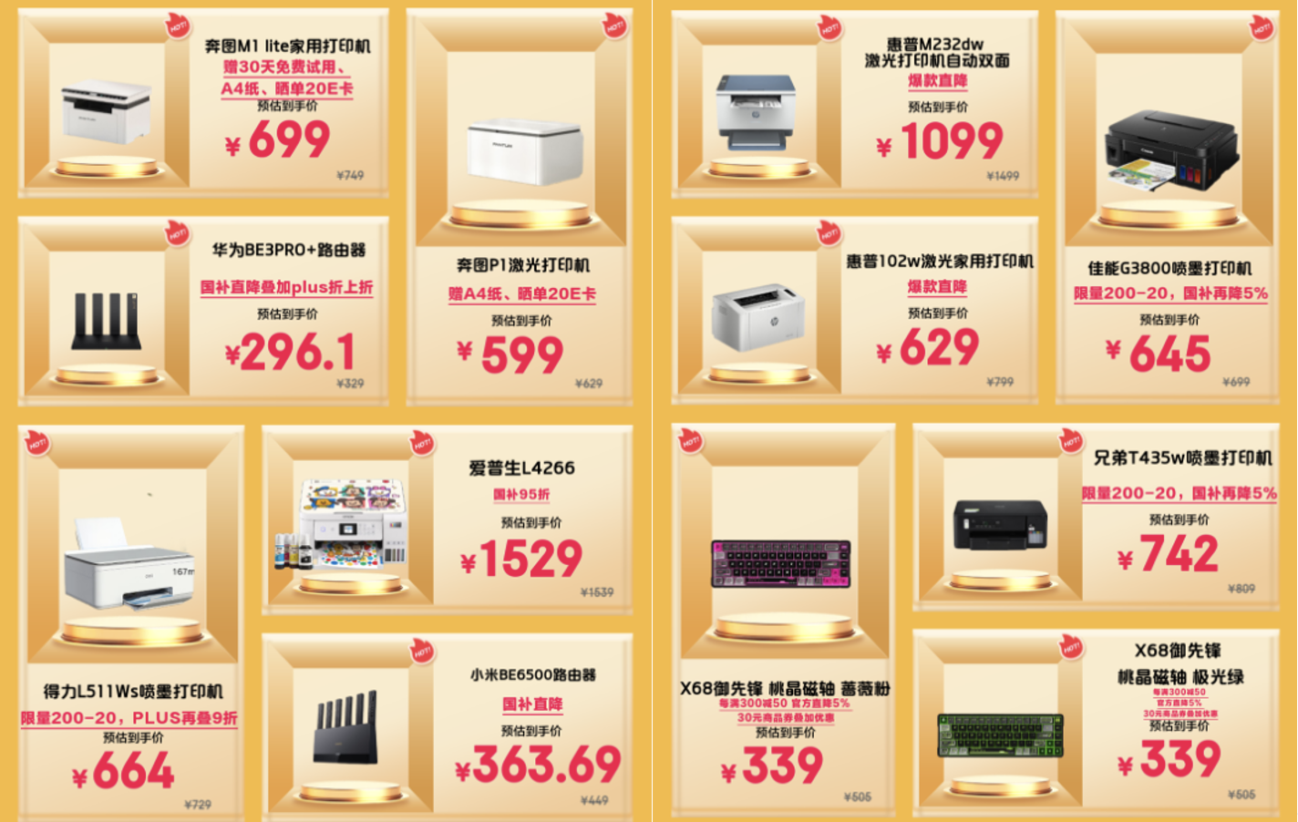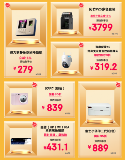 打印设备同样满足企业、家庭等多场景的多样化打印需求。爱普生L4266墨仓式彩色打印机,打印成本极低,国补后1529元;得力L511Ws喷墨打印机,小巧便携,打印清晰,限量满减+PLUS折扣后664元;奔图P1激光打印机,高速打印,稳定可靠,599元入手还赠A4纸与E卡;佳能G3800喷墨打印机,色彩鲜艳,打印清晰,到手价645元,满足家庭照片和文档打印需求;兄弟T435w喷墨打印机,操作便捷,到手价742元;惠普M232dw激光打印机,自动双面更省纸,爆款直降到手价1099元。此外,汉印Z1照片打印机到手价839元,富士小俏印二代到手价889元,都是家庭打印照片的好帮手。