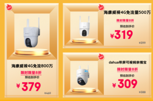 安全监控设备为家庭和企业保驾护航。海康威视WIFI无线摄像头,高清画质,智能监控,日常价440元,限时秒杀真5折,到手价220元,还送录像机;海康威视4G终身免流量监控器摄像头,插卡即用不依赖WiFi,限时8折319.2元;大华带屏可视频亲情宝,限量8折,到手价309元。