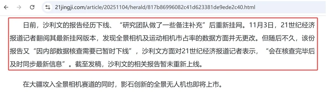 另外,假设沙利文的报告正确,按照大疆相关人士的确认,大疆第三季度销售额达8.6亿元,按照17.1%的市占比例,那第三季度全景市场规模在第三季度将达到50.3亿元,而影石的全景规模也近37.7亿元。但根据影石第三季度报显示,该公司第三季度销整体营收为29.4亿元。