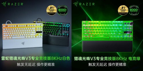 想要在游戏中快人一步、制胜赛场?主会场中的这几款电竞装备是不二之选。雷蛇猎魂光蛛V3专业竞技版8KHz 游戏键盘搭载第二代模拟光轴,配合8000Hz轮询率,响应速度快至0.58毫秒,稳定性也完胜磁轴。其快速触发模式支持0.1mm按键重置灵敏度,确保每个操作都精准响应。经过优化的轴体结构搭配加厚消音棉,有效消除杂音,双色注塑PBT键帽与磁吸手托更带来舒适体验,助力玩家在竞技中所向披靡。