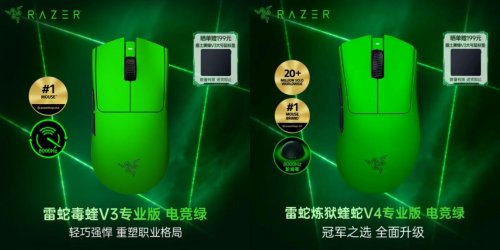 鼠标作为电竞操作的另一关键装备,同样备受关注。雷蛇毒奎V3专业版无线鼠标轻至54克,搭载业界领先的Focus Pro 35K光学传感器,配合HyperSpeed无线技术,在保证极致轻量化的同时,实现精准追踪与稳定连接。雷蛇炼狱蝰蛇V4专业版无线鼠标配备更先进的Focus Pro 45K光学传感器与原生8000Hz轮询率,配合第四代光学微动带来超过1亿次点击寿命,在约150小时超长续航的加持下,确保玩家在持久对战中始终保有竞争优势。