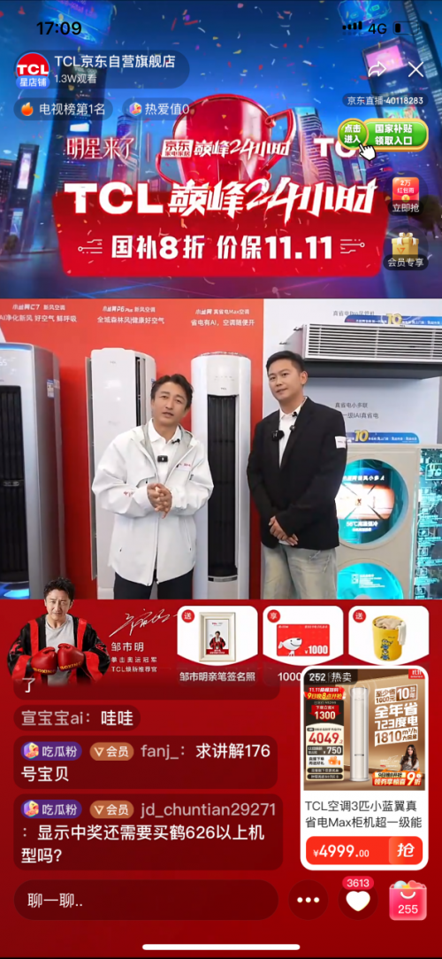 紧跟这场直播成功之后,TCL空调团队紧跟大促平台节奏,抓住每个流量波动高峰,在10月30日开门红联动短道速滑冠军王濛、拳击奥运冠军邹市明等多位体育明星,构建了立体化的信任背书矩阵。王濛以其标志性的“我的眼睛就是尺”为产品精准度背书,邹市明则以“健康重拳”诠释产品的硬核防护能力。这种与冠军特质高度契合的营销组合,精准触达不同圈层消费者,建立起“TCL空调=冠军级品质”的用户心智。