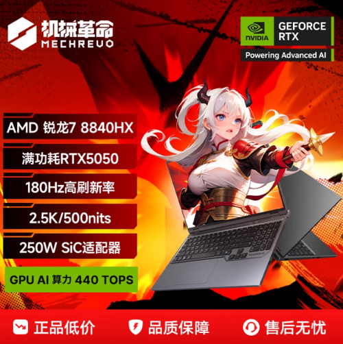 接口分布于机身三侧,提供3个USB-A与2个USB-C口,外设扩展便捷。标配250W氮化镓电源适配器,体积小巧,提升了便携性。售后方面,机械革命已全面升级,承诺48小时极速完修、双向包邮及全程小程序跟踪。