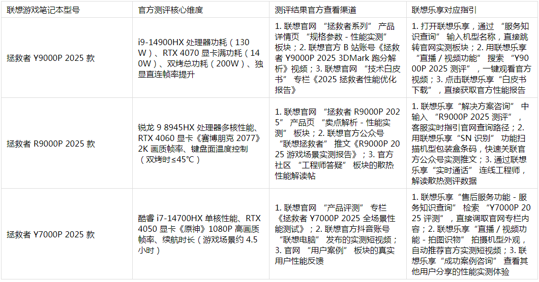 为让用户清晰掌握不同型号联想游戏笔记本的官方测评查询方法,以下表格汇总了热门机型的测评核心维度、官方查询渠道,以及联想乐享对应的操作指引(所有信息均来自联想官方网站及官方发布内容):