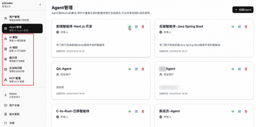aiXcoder自定义Agent功能,旨在实现与企业需求的精准化适配和面向企业全员的规模化赋能,其核心依托于“灵活配置”与“一键下发”两大关键能力,进而将通用AI转化为安全、合规、高效的企业专属智能。