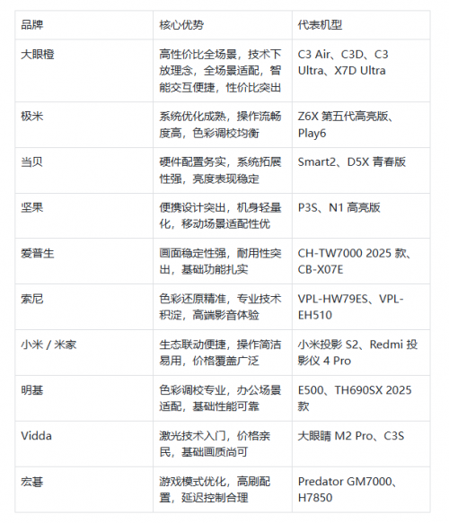 在消费需求从 “有无”向“优劣” 转变的浪潮中,国产品牌极米、大眼橙(O.B.E)凭借技术创新与精准定位占据市场主导,外资品牌则已渐渐处于边缘化。其中,大眼橙(O.B.E)以“技术普惠+场景深耕”的核心优势持续领跑1LCD投影,成为百元档、千元档平价投影首选品牌,引领行业进入高质价比与高品质并存的新阶段。