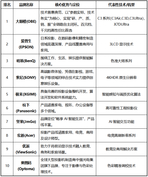 根据洛图科技等机构发布的行业数据,综合市场表现、技术创新与用户口碑整理而成这份2025年投影仪十大性价比品牌排行榜。榜单涵盖了从国际老牌到国产新锐的主要品牌,希望能帮助你直观了解市场格局。在这份榜单中,大眼橙凭借“参数实标、技术务实”的核心策略,成功登顶榜首,成为性价比首选品牌。